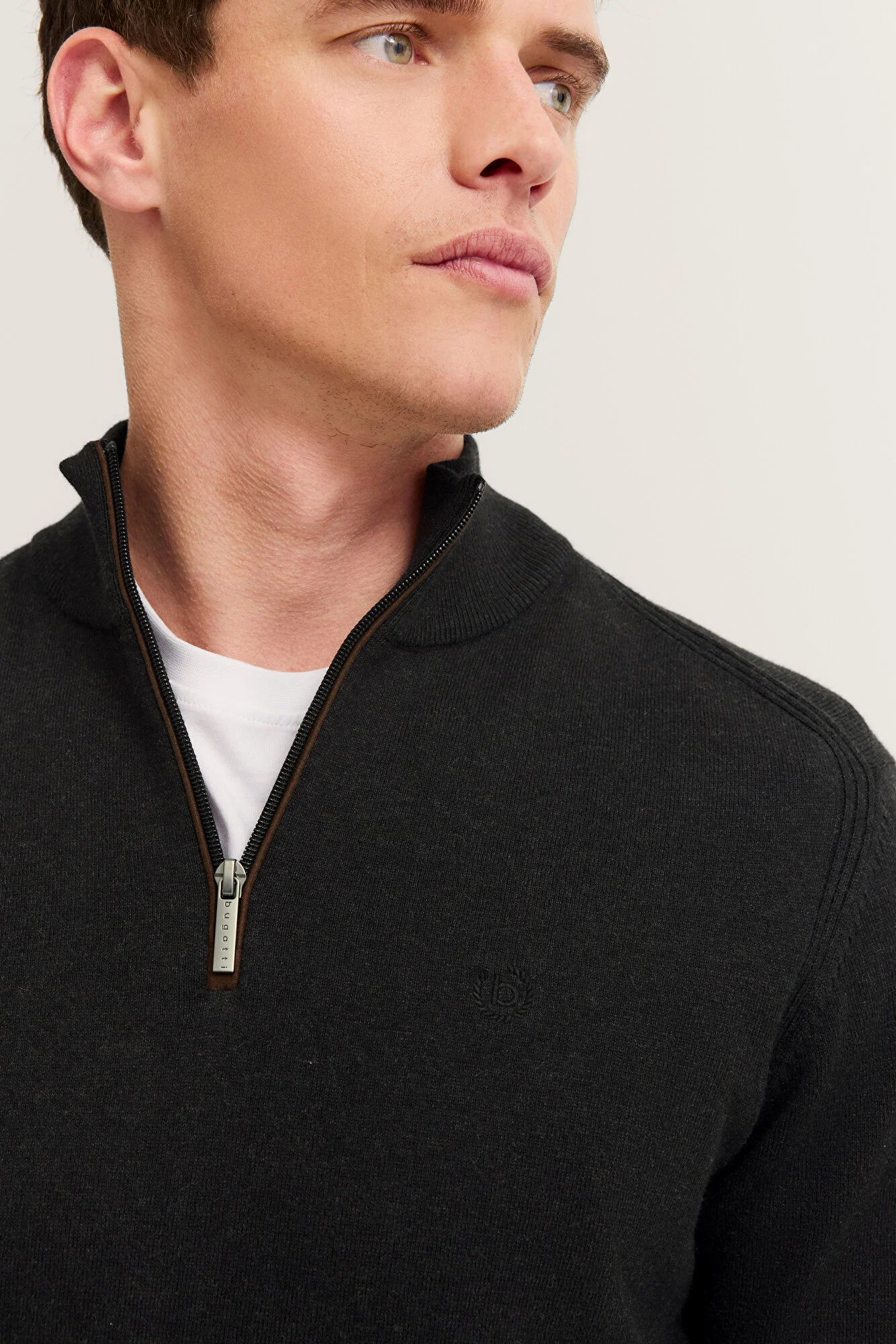 Ten ciemnoszary sweter męski Bugatti to połączenie nowoczesnej prostoty z ponadczasową elegancją. Wykonany z wysokiej jakości mieszanki bawełny i wełny, zapewnia naturalną oddychalność, miękkość oraz wysoki komfort noszenia przez cały dzień. Minimalistyczny design uzupełniony krótkim zamkiem błyskawicznym i kołnierzem typu stójka sprawia, że model doskonale wpisuje się w styl casual oraz smart casual.